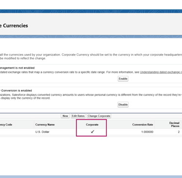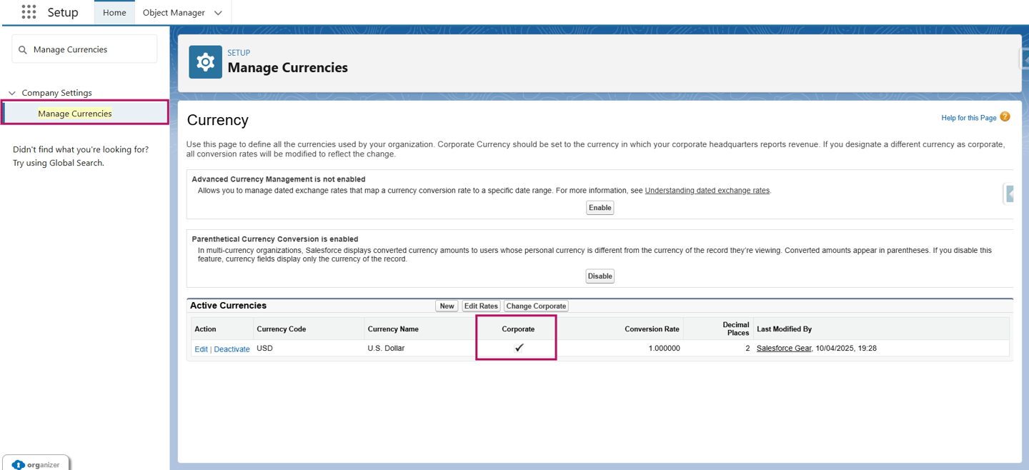 Accede a Setup > Manage Currencies. Verás una única moneda precargada como Corporate. Esta puede cambiarse si agregas al menos dos monedas.