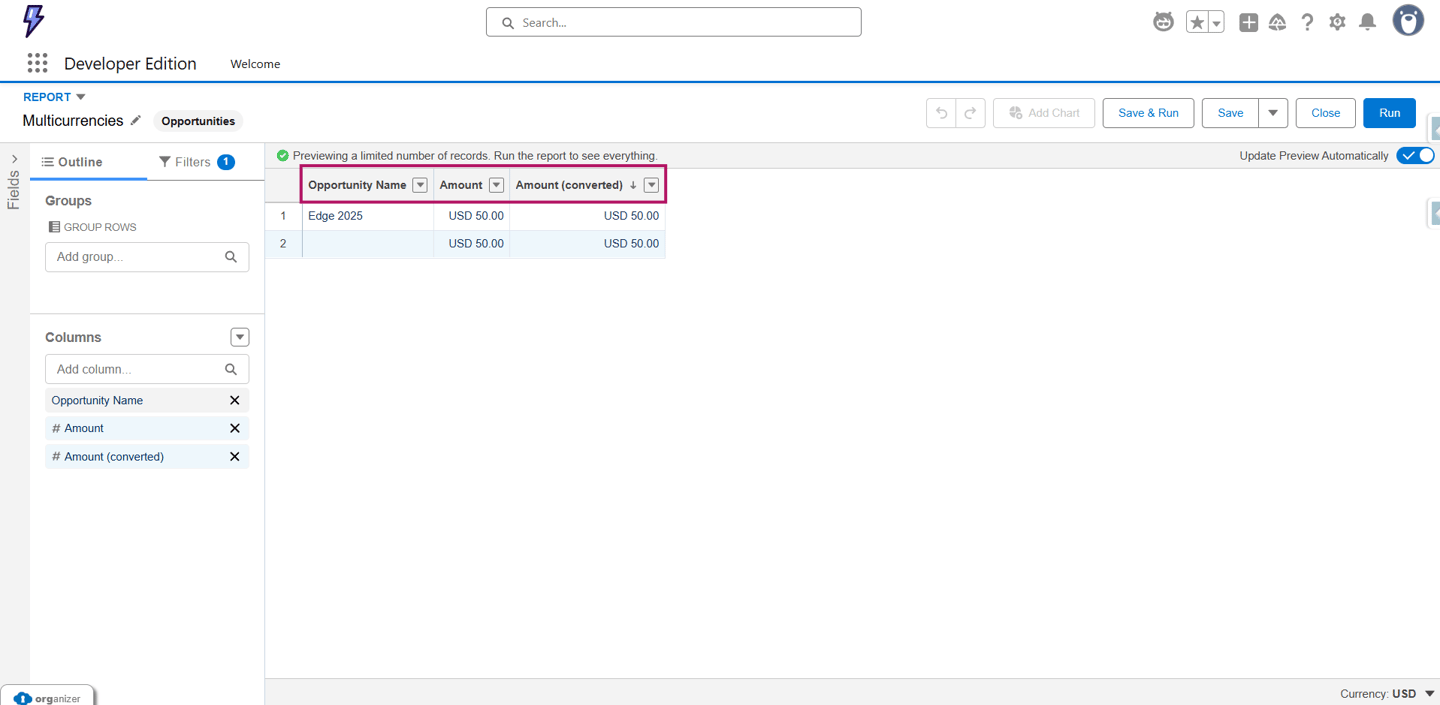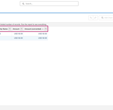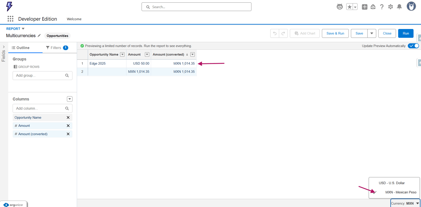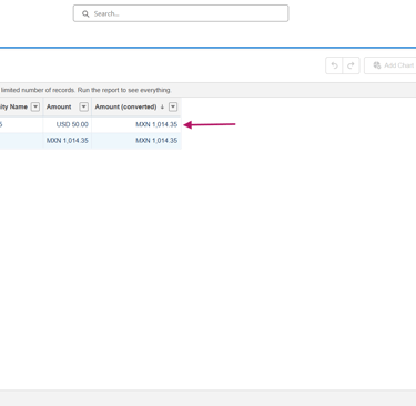 Ahora procederemos a crear un reporte. En este reporte agregaremos las columnas Nombre de la oportunidad, Amount y Converted Amount. Sin embargo, al visualizar los datos, pronto nos daremos cuenta de que el Converted Amount sigue apareciendo en la moneda corporativa.