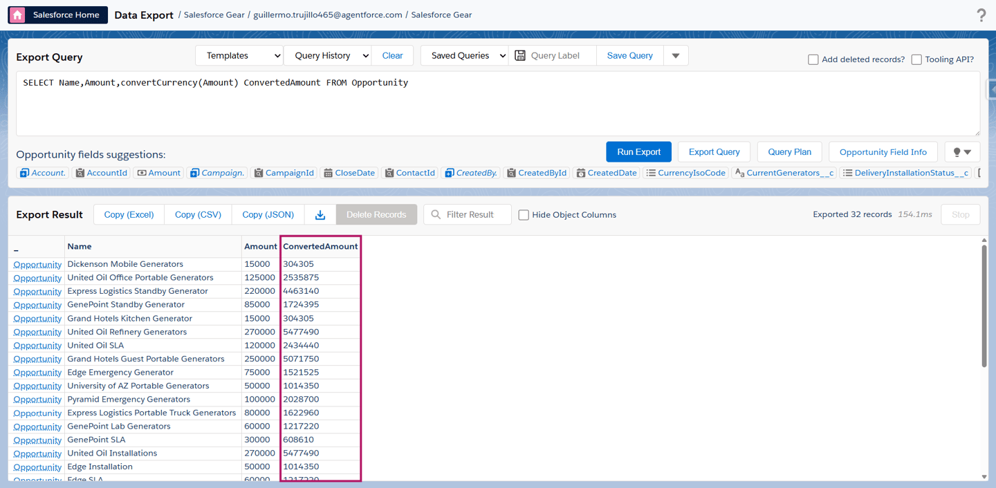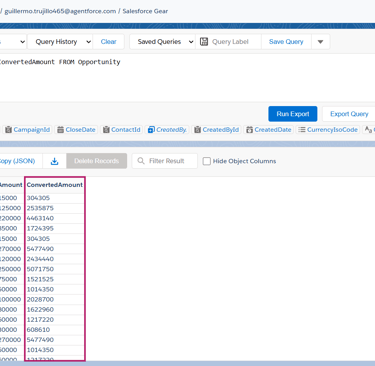 ¡O incluso podemos obtener la información ya convertida directamente desde una consulta SOQL, usando la función convertCurrency() para ver los valores en la moneda corporativa sin necesidad de hacer cálculos manuales!