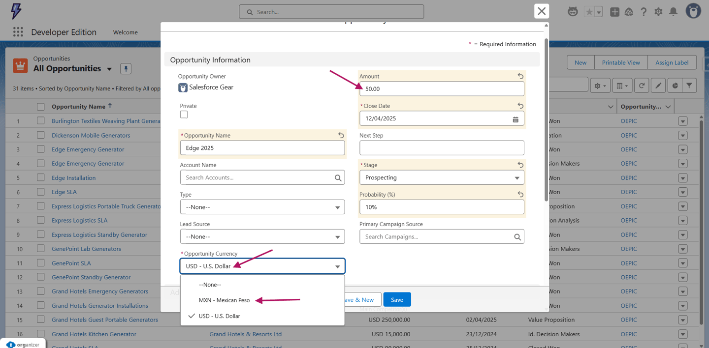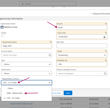 Al crear una nueva Opportunity, la Currency aparecerá por defecto como USD, pero en el campo se mostrarán las monedas que hayas configurado, incluyendo peso mexicano (MXN). Para este ejercicio, asigna un Amount de 50 USD.